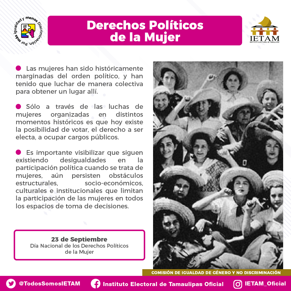 - Impulsar acciones de difusión, promoción, formación y de acompañamiento institucional para la promoción de los derechos ciudadanos y políticos con igualdad de género en Tamaulipas.