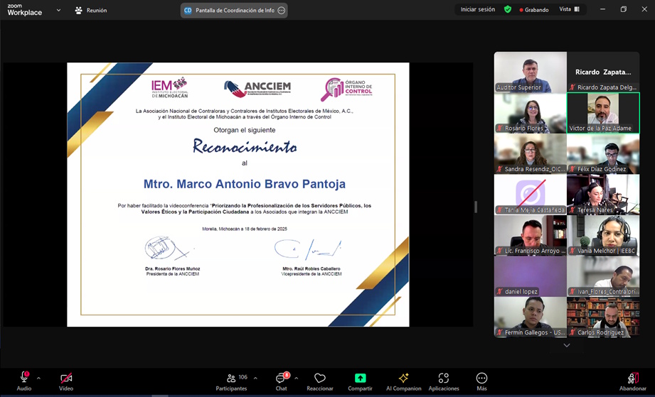 El personal del Órgano Interno de Control (OIC) participó en la videoconferencia "Priorizando la profesionalización de los servidores públicos, los valores éticos y la participación ciudadana", impartida por el Contador Público Marco Antonio Bravo Pantoja, Auditor Superior del Estado Michoacán, el presente 18 de febrero de 2025.