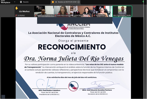 Con el objetivo de fortalecer las capacidades institucionales y afrontar con mayor eficacia los desafíos actuales en materia de fiscalización y transparencia, integrantes del Órgano Interno de Control (OIC) del Instituto Electoral de Tamaulipas (IETAM) participaron activamente en el curso por videoconferencia titulado “Los Retos de los OIC ante el Nuevo Modelo de Transparencia”, convocado por el Maestro Raúl Robles Caballero en su calidad de Presidente de la Asociación Nacional de Contraloras y Contralores de Institutos Electorales de México S.A. (ANCCIEM).