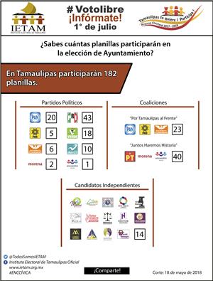 Finalmente, cabe mencionar que en Tamaulipas para la elección local se elegirán las 43 Presidencias Municipales, con sus respectivos Cabildos, el día de la elección que de acuerdo al calendario, será el próximo 1 de julio de 2018.